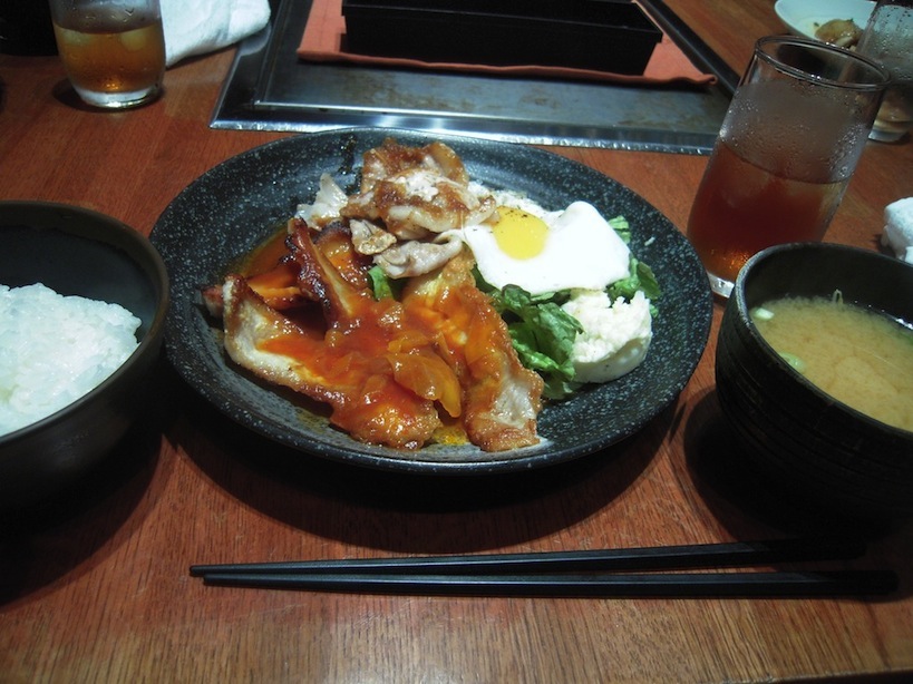 その中の鉄板焼きのお店で、3種の豚肉のグリルのランチを食べました。ボリュームたっぷり、美味しい、しかも安い。さすが、大阪。