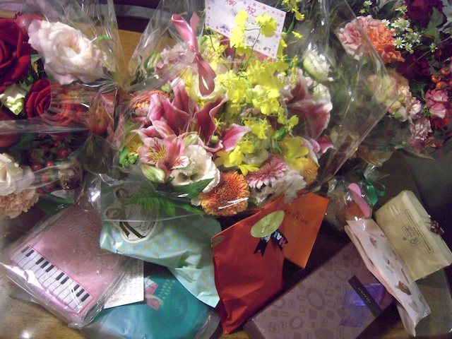 生花の入ったダンボール箱2箱に、来てくれていた友人たちからのプレゼントや今日の記念品もいただいて、大荷物でタクシーで帰りつきました。