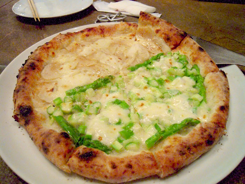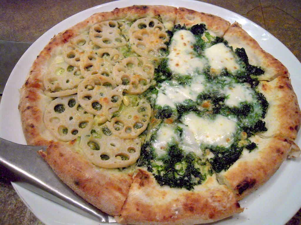 そしておまちかね、ピザがきました。レンコン、生海苔、新生姜、アスパラガス。