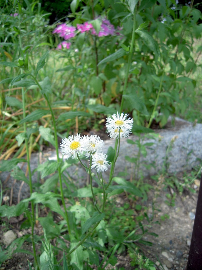 ナデシコのそばに、花壇の枠からはみ出て咲いていたヒメジョオン。