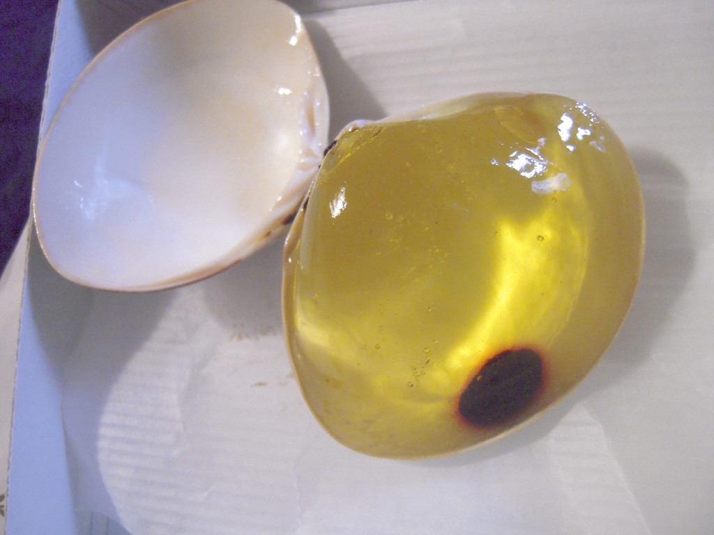 浜土産(はまづと)は貝殻をあけると透明な琥珀羹。茶色く見える粒は大徳寺納豆です。このひと粒がおつなんです。