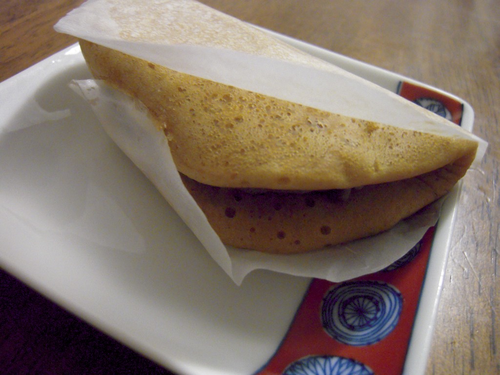 黒糖入りの蒸した生地に、あずきのクリームがはさまれています。