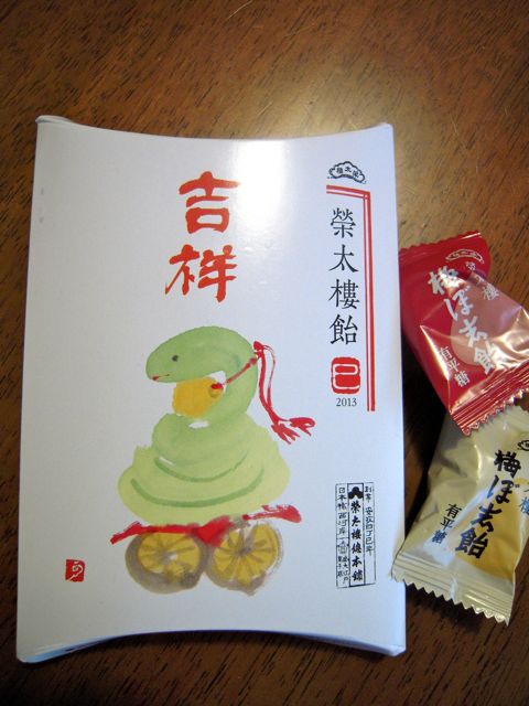 東京の飴屋さんの老舗、栄太樓総本舗の飴をいただいていたのですが、その箱にも可愛い蛇が金の鈴を首に付け、金の俵に乗っている絵が描かれています。