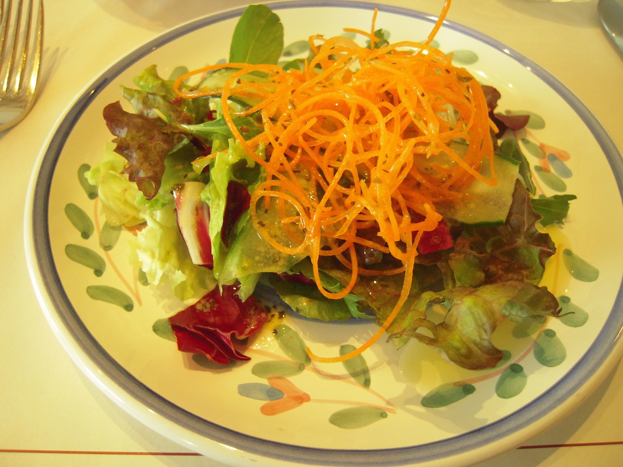 サラダ、パスタ、ドルチェ、コーヒーの軽いコース。