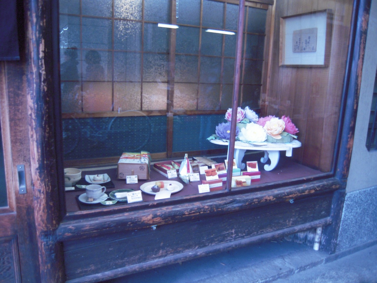 和菓子屋さんの三條若狭屋の飾り窓の牡丹の花がとてもきれいです。