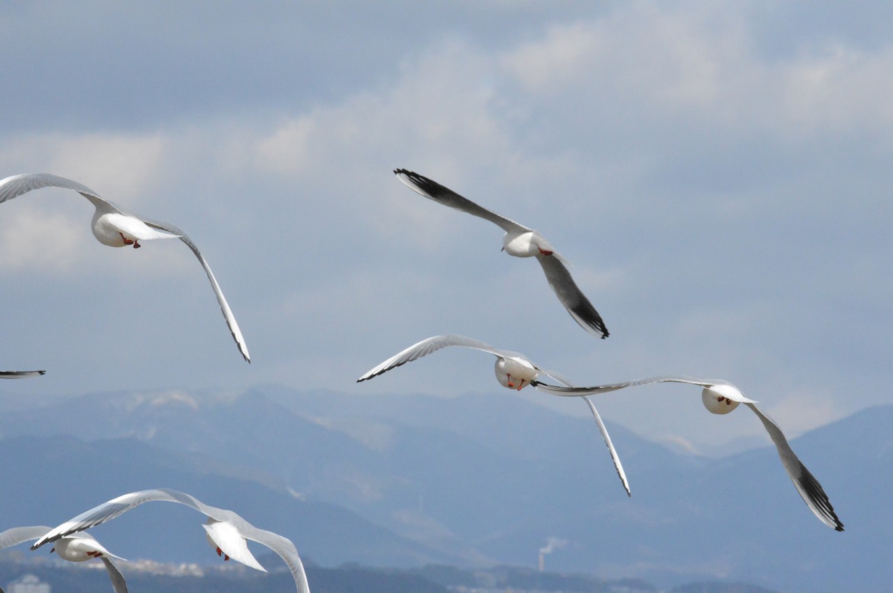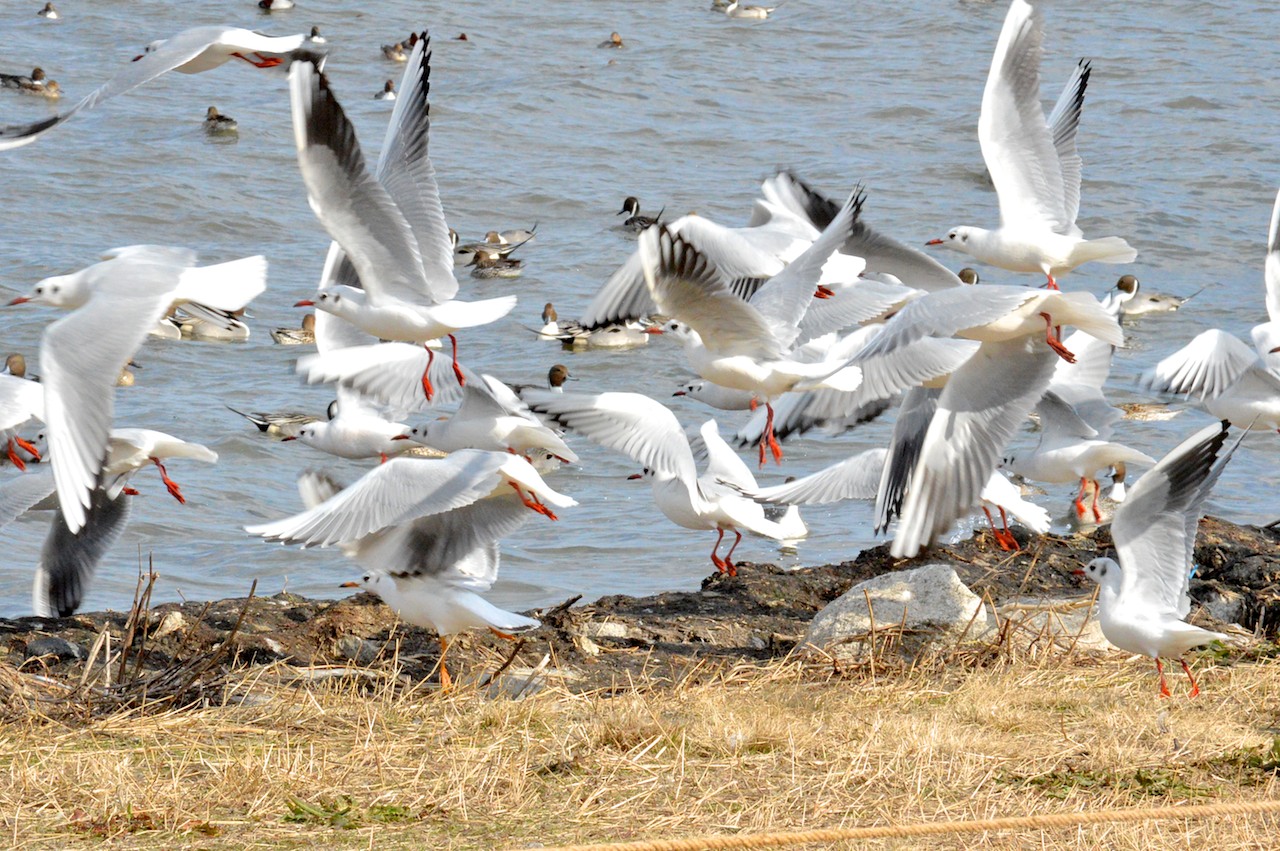 ゆったりと泳ぐカモたちと違って、ユリカモメは飛ぶ、飛ぶ。