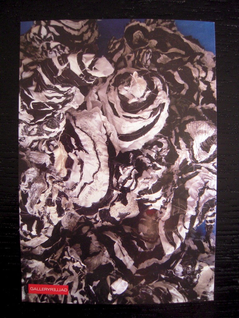 ガラス張りでシンプルな15帖ほどの展示室の、天井から吊るされた巨大な作品。白と黒が交互に円を広げるように縫い合わされた塊が、塊同士もボコンボコンとくっついて、床にも増殖していってるような作品。