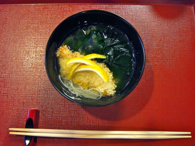 わかめと鯛にあられのような衣(後に判った、それは道明寺粉)をつけて揚げたものが乗っていて、柚子の皮の香りがたまりません。