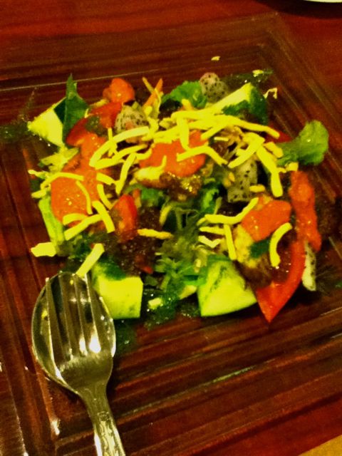 ・鮮魚のグリルのインド風サラダ(鮮魚の切り身をグリルにしたものがゴロゴロ、キュウリ・トマト・ドラゴンフルーツもゴロゴロ、葉っぱの野菜などが入っていてスパイシーなドレッシングがかかっていました)