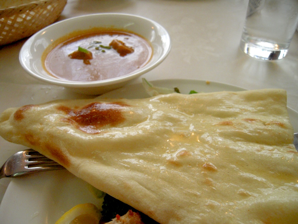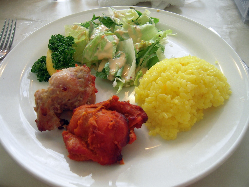 スープ、チキンティッカなどの前菜、バターチキンのカレー、ナン、ヨーグルト、そして冷たいチャイ。