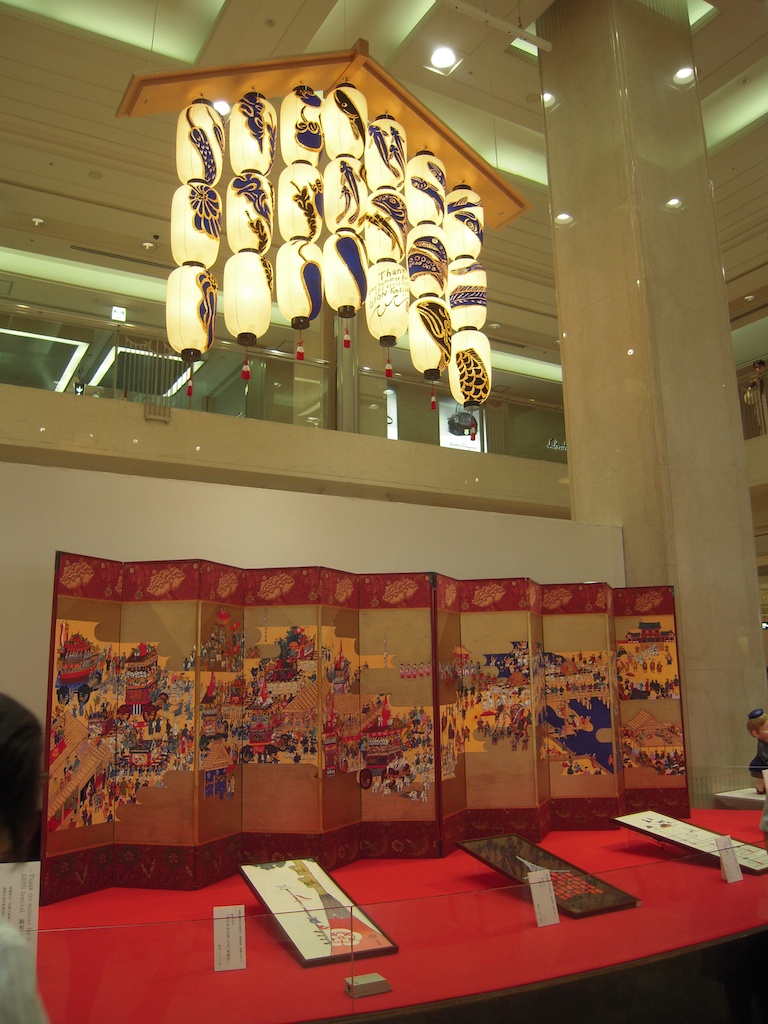 京都タカシマヤでも正面玄関には祇園祭にちなんだデコレーション。待ち合わせの人々もいつもより多く、祭りのざわめきが感じられます。