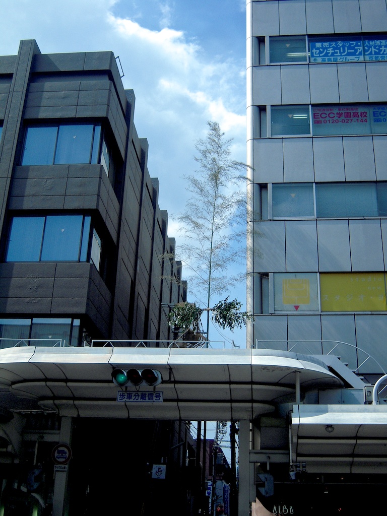 麩屋町通の角には、四条通を挟んで竹が建ててあります。これは、明日の山鉾巡行のとき先頭を行く長刀鉾に乗ったお稚児さんが結界を破るためにエイっと切る、しめ縄が張られる竹です。