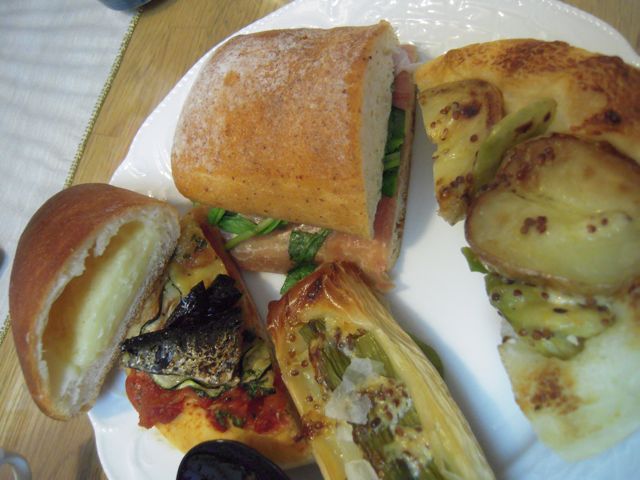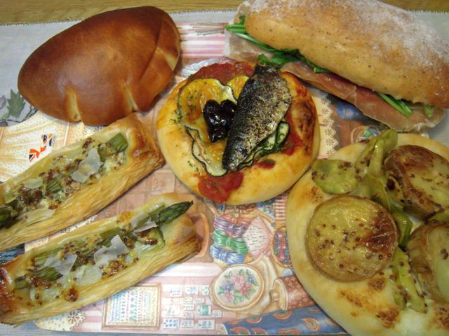 そこから時計回りにちょっと下になるのが地中海風いわしのピゼッタ(小さなピザということでしょうか)、生ハムのパニーニ、じゃがいもとそら豆のガレット、左下の小さな二つはアスパラガスのクロワッサン。