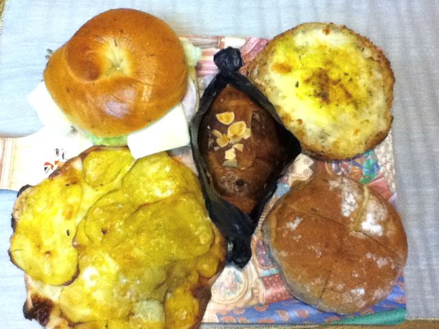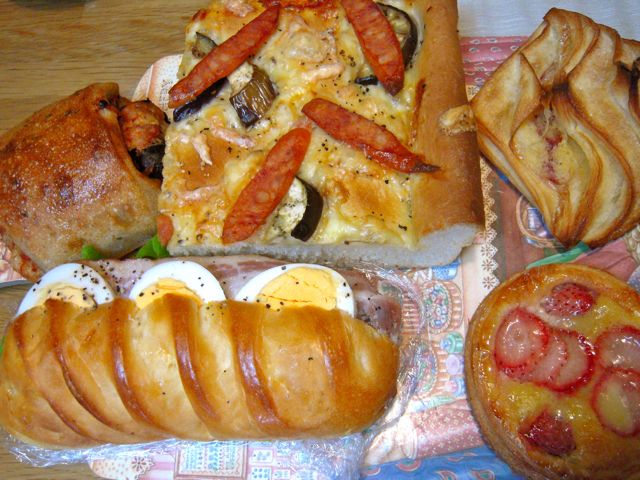 この日のパンは右下から時計回りに、イチゴのクロワッサン、ヴィエノワのサンドイッチ、トラディショナル(ドライトマト、オリーブ)、ナスとチョリソーのフォカッチャピザ、クロワッサン・オー・フリュイ(フルーツのクロワッサン)でした。