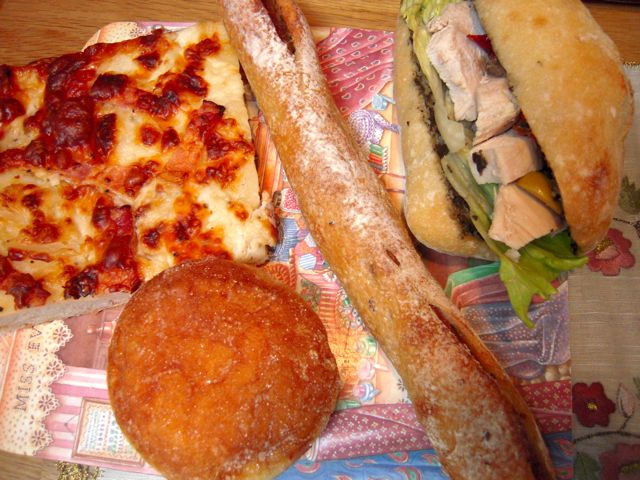 ベーコンポテトピザ、フランボワーズのベニエ(ここでは揚げドーナツ)、ソーセージの入ったオリーブ練り込みのフランスパン、タプナードと鶏のサンドイッチ。