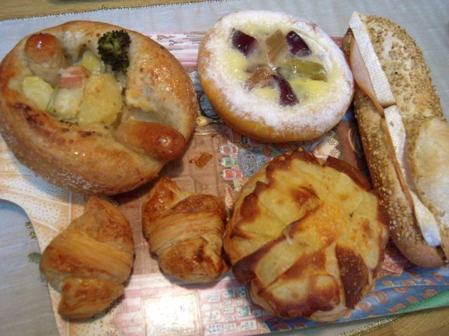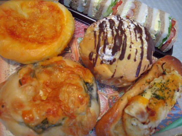 カラフルミックスサンド(ソーセージの具がめずらしい)、シューショコラ(シュー生地がパンに乗って焼かれているのがめずらしい、ホイップクリームが入ってます)、ハッシュドポテト&オニオン、ほうれん草とクリームチーズ(ほうれん草がたっぷり)、チーズボロネーゼ(文字通り、ミートソース入り)。