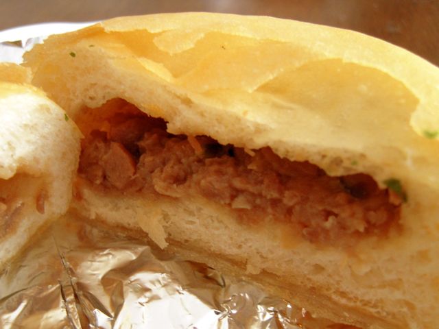 もっちり生地の揚げパン風の中に、キャベツと紅しょうがのみじん切りをマヨネーズであえたものがぎっしり入っています。たこ焼きソース、かつおぶし、青のりでしっかりたこ焼き風味。