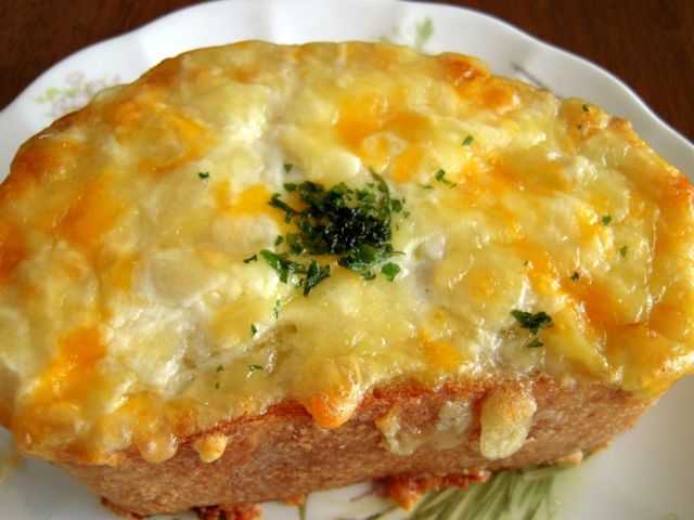 フランスパンの上にホワイトソースをたっぷりのせ、その上に2種類のチーズ。