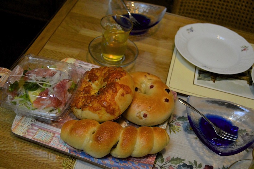 左上から時計回りに。タマネギとブルーチーズ。くるみパン。ヘーゼルナッツのサンライズ。ソーセージ入りのパン。クランベリーレモン。