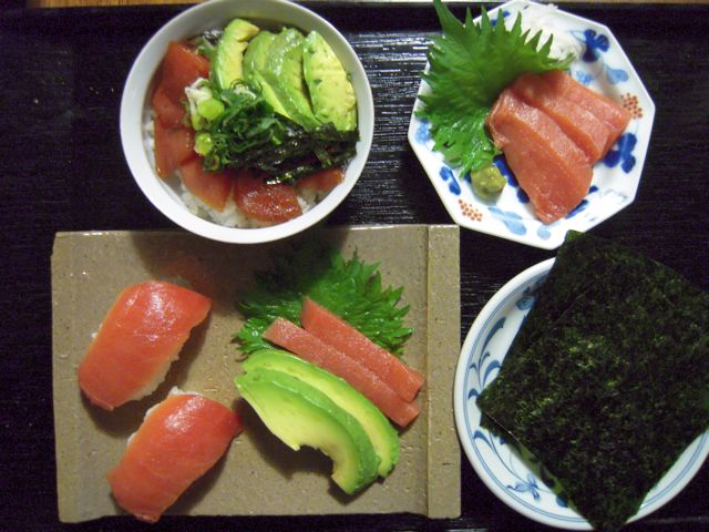 刺し身、にぎり、手巻き、ミニ漬け丼。量的にちょっと物足りない部分はアボカドで補って。