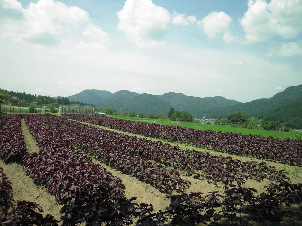 終点の大原に降り立つと、大原特産の赤しそが収穫期を迎えていて、赤と緑のコントラストが美しい。