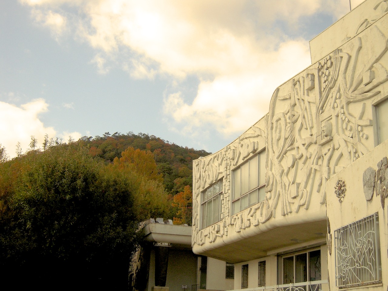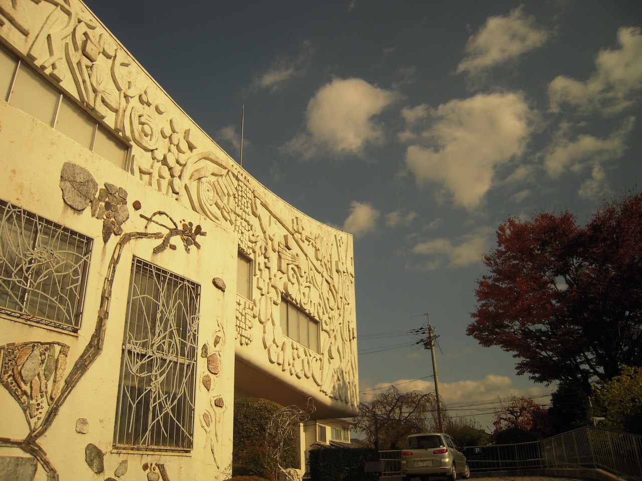 衣笠山を背景に建つ、不思議な形の不思議な模様のついた白い建物。小学生のときには、美術教育に熱心だった担任の先生と、この建物をスケッチしに来ました。