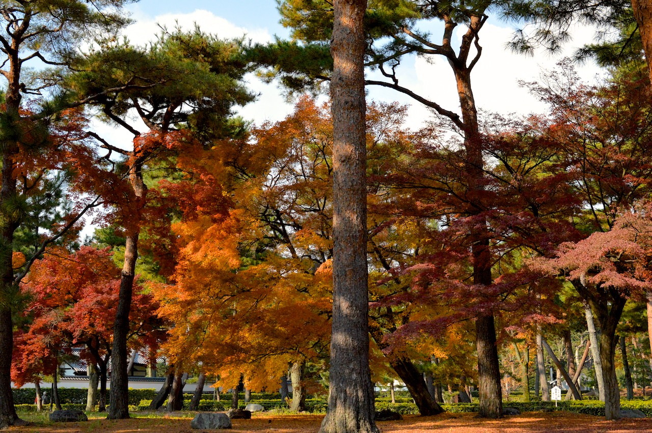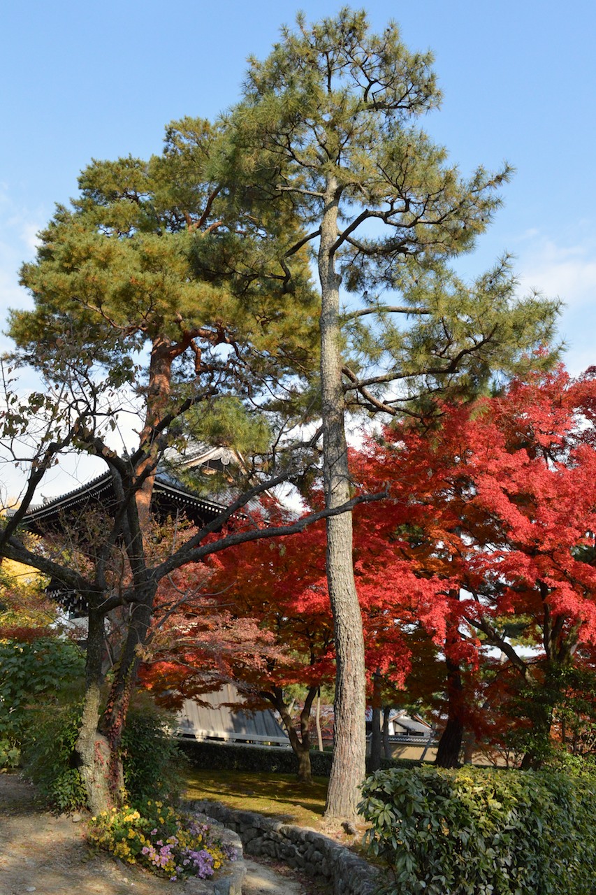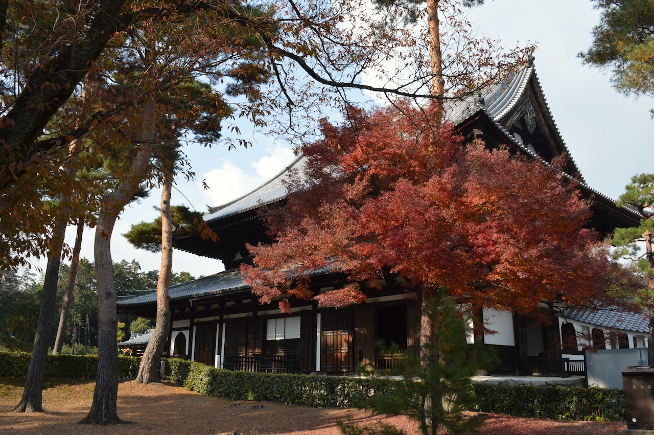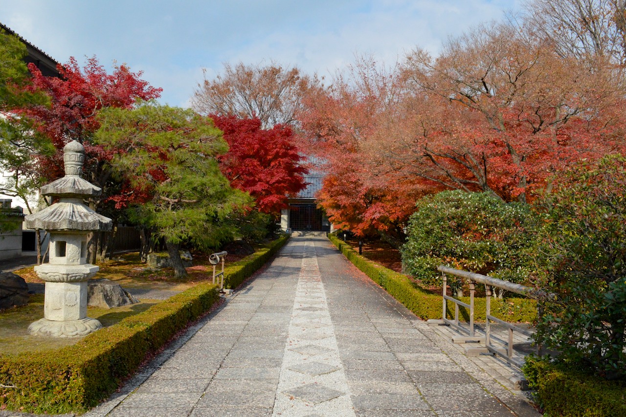 秋の特別公開中の法堂・開山堂へ行く人、承天閣美術館へ行く人、通行する人、通行する自転車、以外、人は少ない。