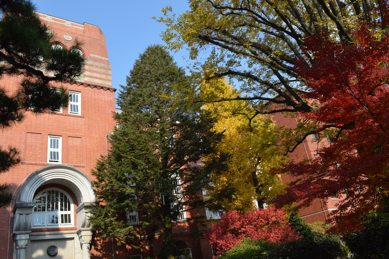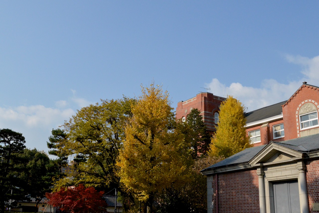 後ろの大きなレンガ造りは同志社大学啓明館。