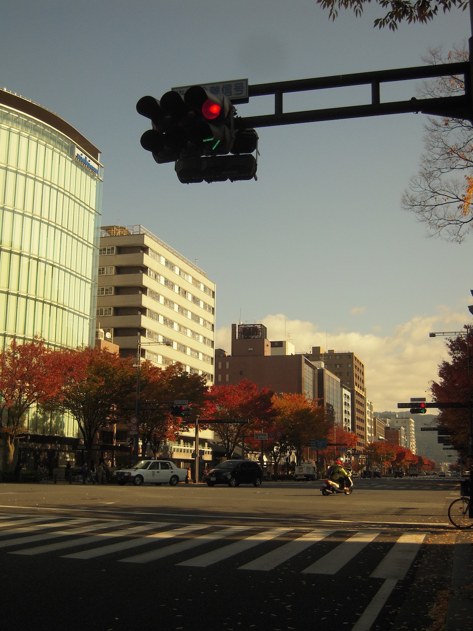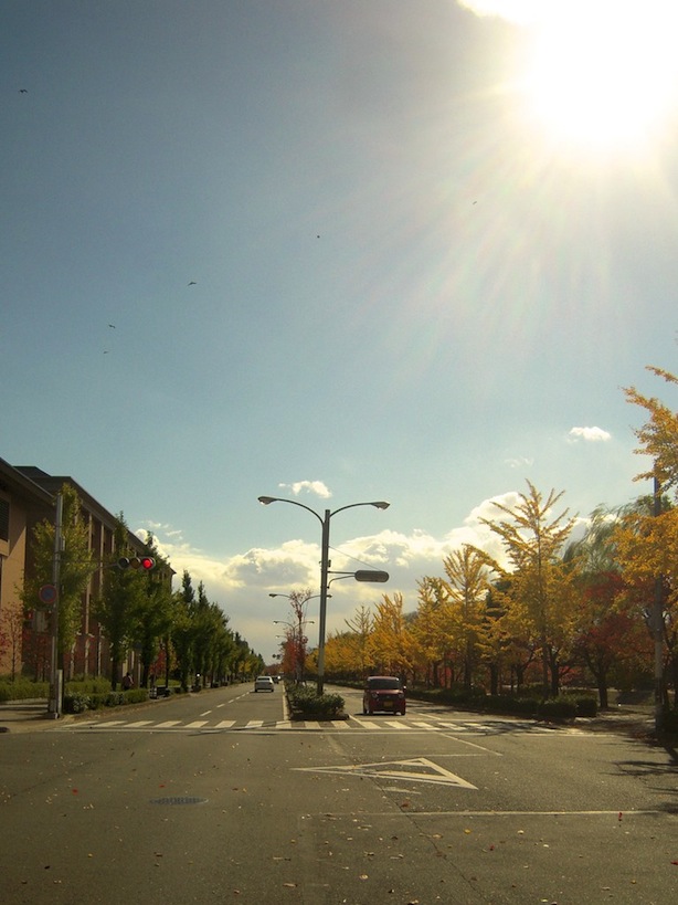 川端通の銀杏が、西側のはみんな黄色いのに東側のは緑色で面白いのよ。という、友人の言葉を思い出して、青信号で渡るときに道の真中から写真を撮ってみました。