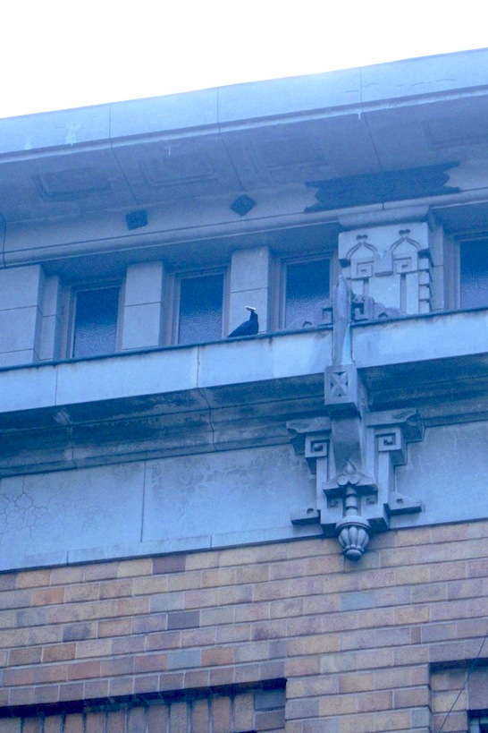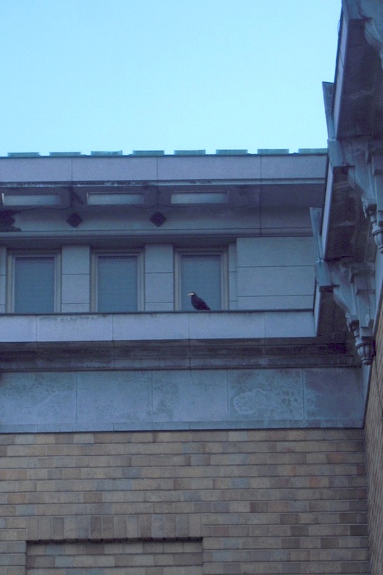 カラスが一羽、くちばしになにか咥えて飛んできて美術館の上のほうに止まったので見に行ってみました。