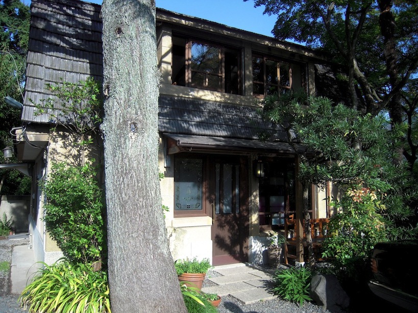 丘に建っていることがわかるスロープの道が続き、到着したらこういう景色。贅沢な日本家屋と山小屋のような建物があり、浮世離れした雰囲気。