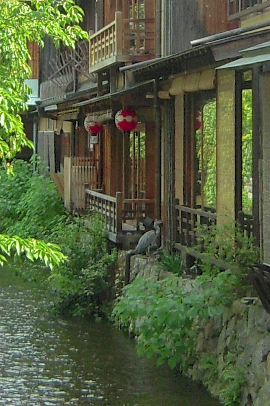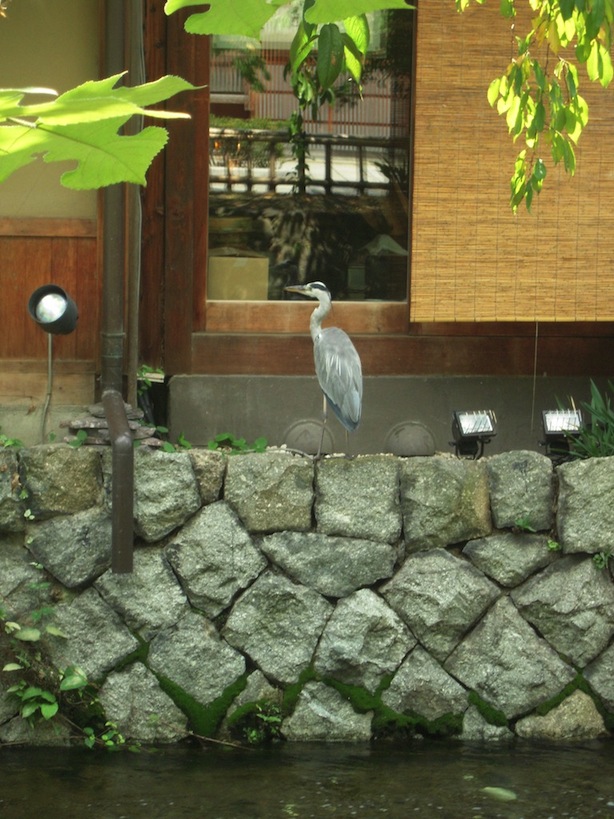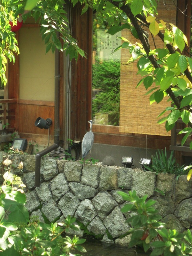 そうしたら、その風景の中にアオサギ発見。『京のお宿 白梅』さんの白川に面したガラス戸に張り付いて、中を覗いているアオサギ。