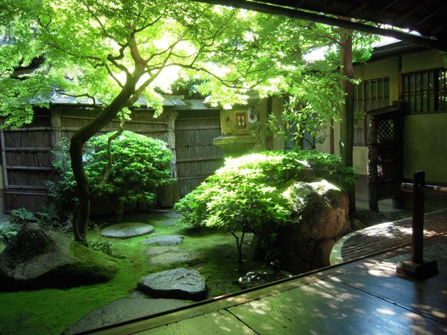 帳場から見える正門付近。正門から玄関へつづく石畳の通路は、かすかに帳場のほうへ斜めに振れていて、帳場からお客様のお顔がよく見えるようになっています。