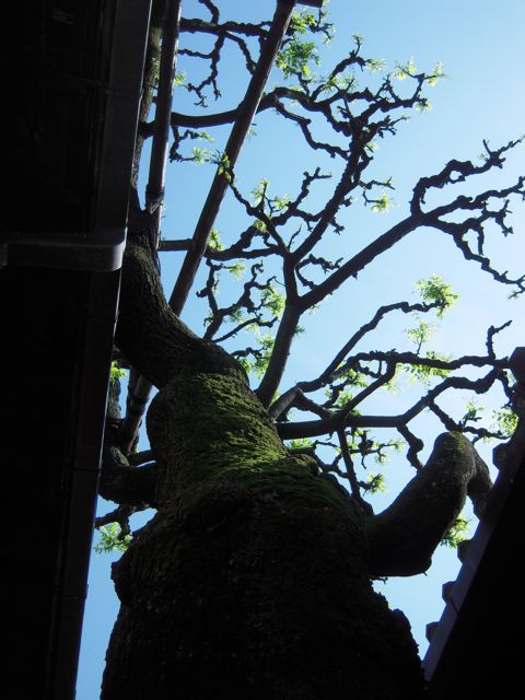 玄関に2本植わっている槐(エンジュ)のうちの1本。葉が茂り始めました。