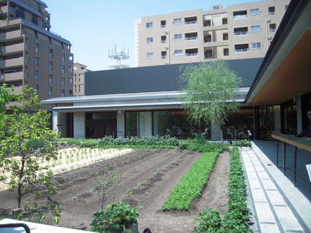 食後はまず3階から。屋上に農園が広がっています。あとで植物のお世話をしている女性スタッフとお話できました。今植わっているのは、ニンジン、ズッキーニ、カラーピーマン、万願寺トウガラシ、賀茂ナスだということでした。そう、九条ねぎも植わっていました。ネギ坊主が印象的。