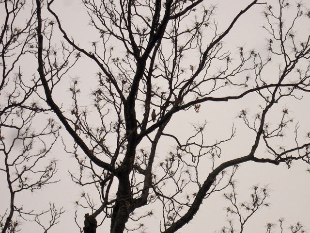 この木の真ん中あたりに見える小鳥のシルエットはヒレンジャクです。