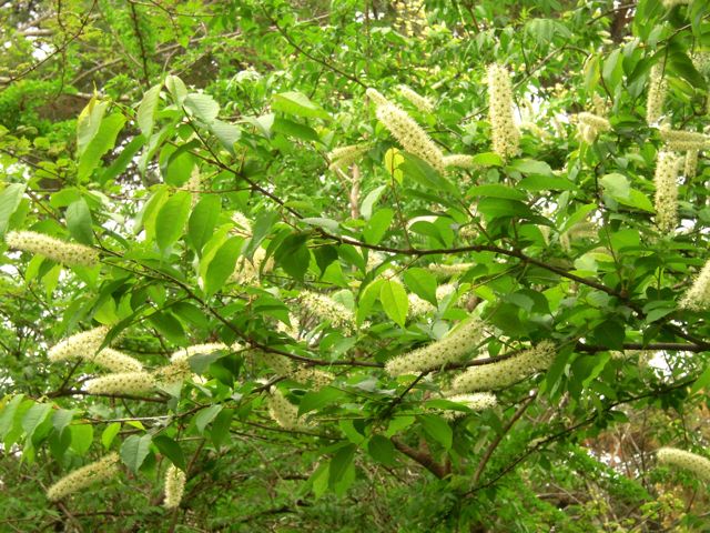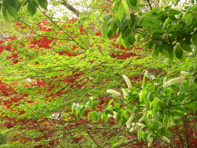 ウワミズザクラの白、いくつかの木の葉の緑、後ろの木の葉の赤
