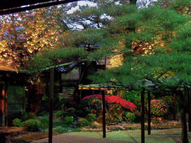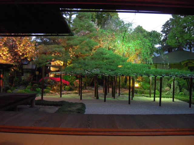「臥龍松の庭」もまだ明るく、残念ながら散ってしまった枝垂れ桜の花びらが地面にたくさん落ちているのがわかりました。それもまた風情があります。