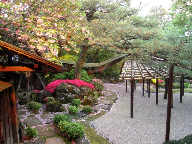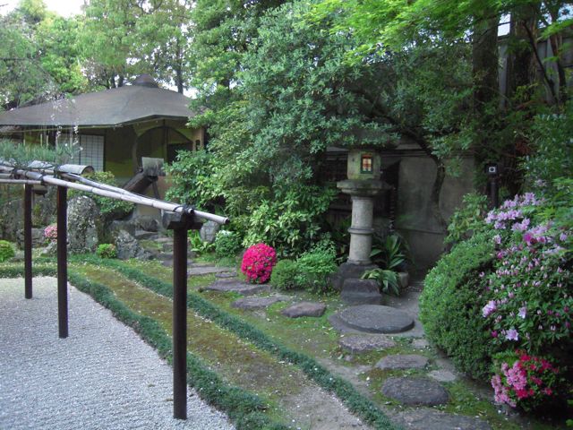 このお庭にはお茶室が三つあります。この写真に見えているお茶室は三角形のオープンテラス式になっていて、腰を掛けてお庭を眺めながらお茶をいただけるお茶室です。