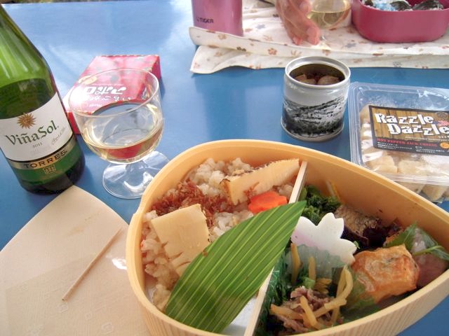 わたしは京都駅のSUVACOで買っていった筍御飯のお弁当。SUVACOでは小さな瓶のワインと、なにか機会があったら買ってみようと思っていた「缶つま」シリーズの「エリンギとマッシュルームのアヒージョ」、それとMade in USAのチーズキューブを調達。