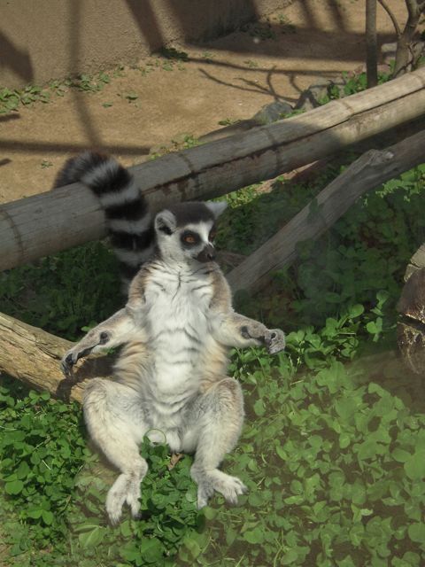 陽の光を浴びるためなのか両手両足をパカっと開くワオキツネザル・学ランが似合いそうリーゼントに剃りこみのようなフサオマキザル。