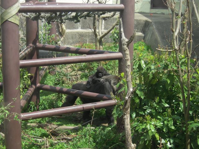 ゴリラは赤ちゃんがお母さんにまとわりついて遊んでいました。