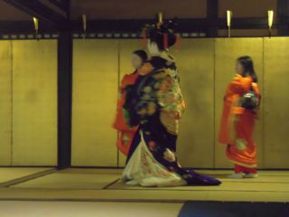 太夫さんは悠然と優雅な所作でお茶をたて、それを禿の女の子が上客に運びます。