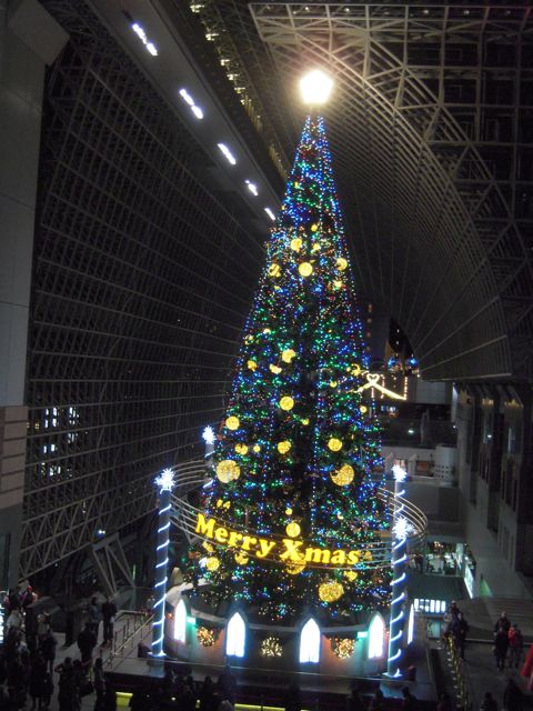 クリスマスシーズンの名物になった京都駅のクリスマスツリーも夜には一層かがやいていました。