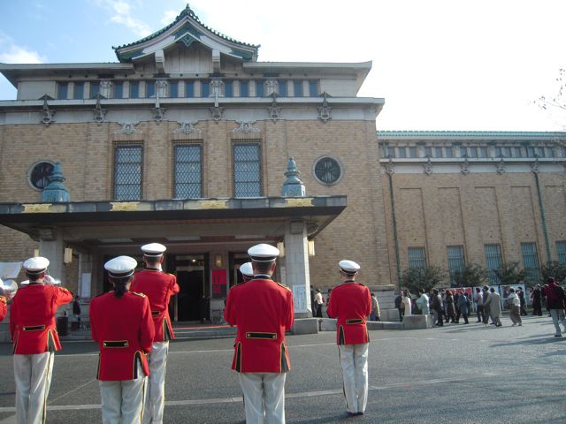 そうしたら、その向かい側の京都市美術館の玄関前で、赤い服を着たひとたちが何やらたくさん動いています。