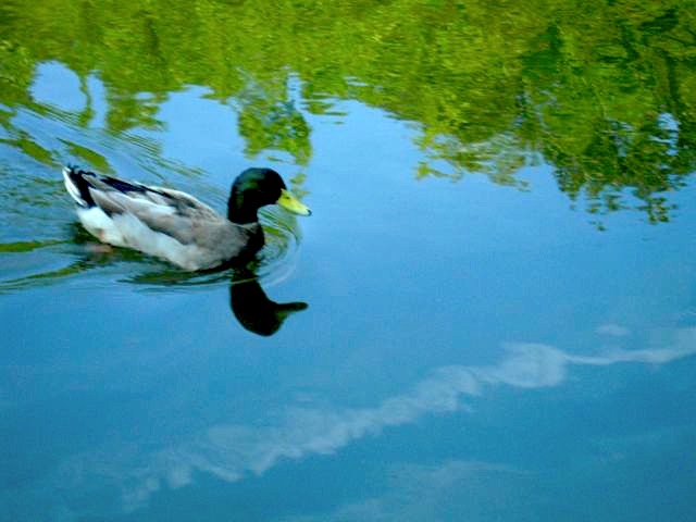 突如、おじさまが色めきたち、わたしにも綺麗な青い鳥が見えました。池の上にしぶきが飛んでいる。