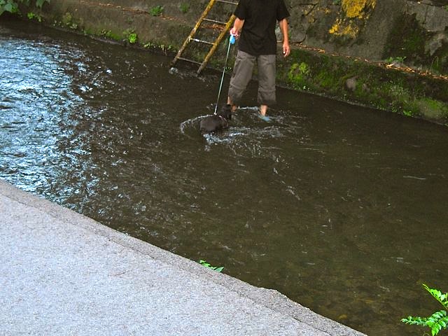散歩中の犬が、川から出たくない、と駄々をこねていました。