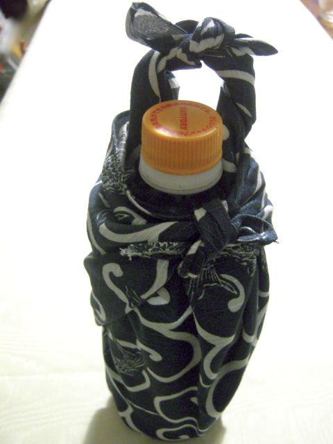 お店の中には、おしゃれな風呂敷の使い方を実践した見本がいろいろ置いてありましたが、特にわたしの目にとまったのがペットボトル包み。