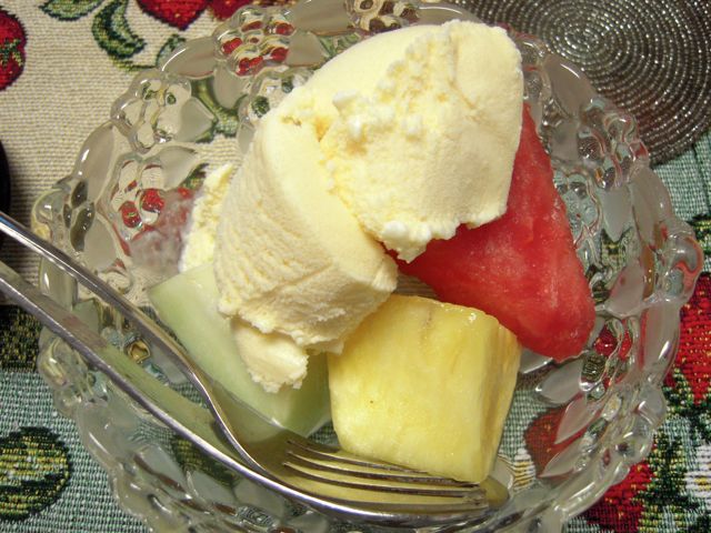 『アトリエ・アルション』の『桃のガトー』、友人の手によるアイスクリームとフルーツの盛り合わせなどをいただき、何杯もお茶を飲み、長々とおしゃべりが続きました。