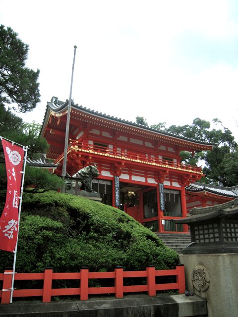山鉾巡行はすっかり有名行事になっていますが、『神輿渡御』が本来は八坂神社の中心行事のようです。山鉾巡行が終わった日の夕方、八坂神社の前(四条通りと東大路通りのぶつかるところ)に出かけると、勇壮な神輿渡御が見られます。